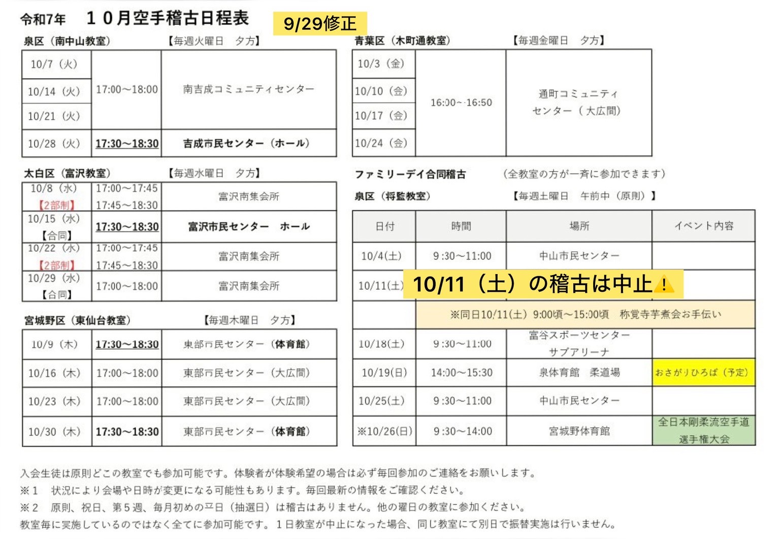 令和7年10月の稽古日程表です(2025/09/29現在)