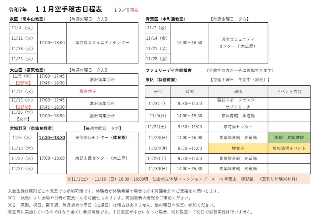 令和7年 11月の稽古日程表です(2025/10/05現在)