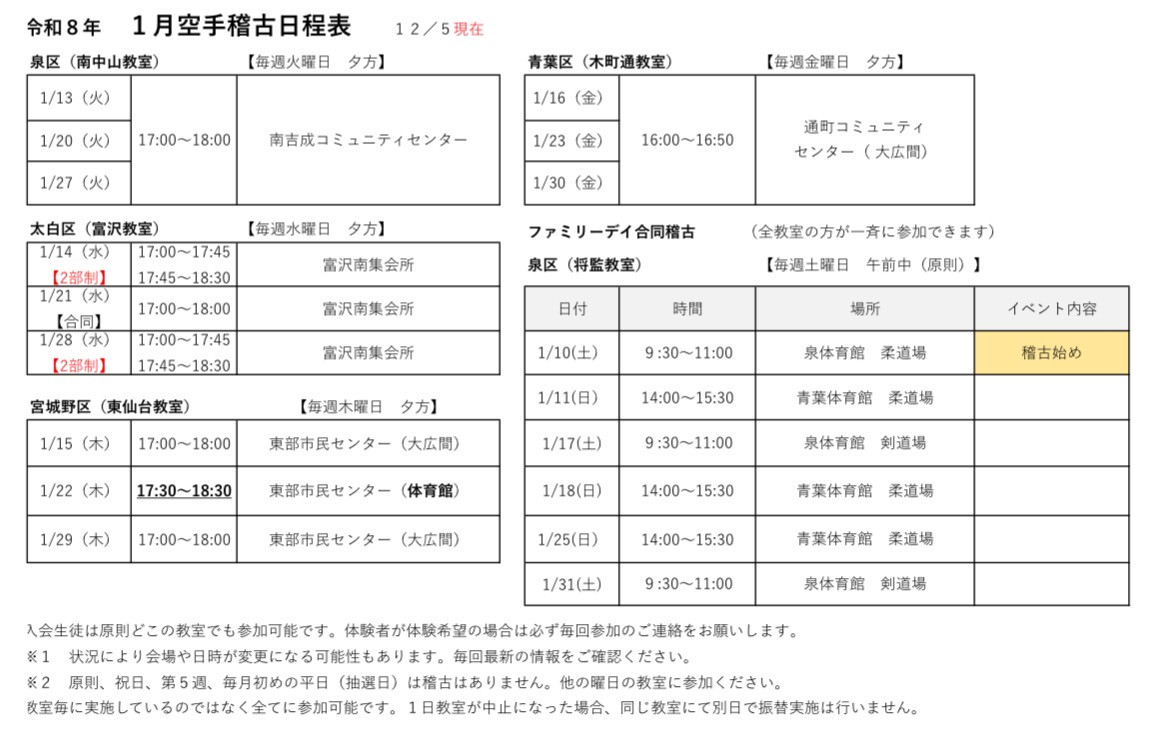 令和8年 1月の稽古日程表です(2025/12/05現在)