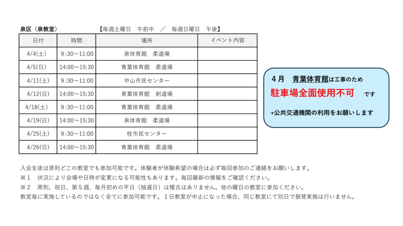 令和8年 4月の稽古日程表①です(2026/03/05現在)